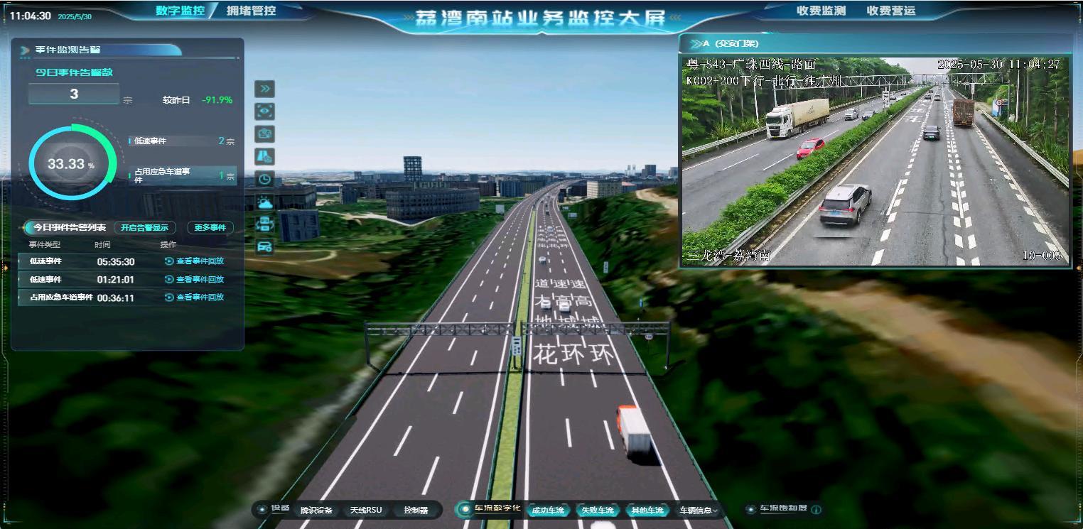 基于广东交通集团高精度数字底图,荔湾南站将收费站及附近主线实景进行数字重构,搭建业务监控大屏系统,实时获取每一辆通行车辆的轨迹,为拥堵预测、应急调度提供精准数据支撑。当发生车辆滞留时,系统能自动检测并生成事件报告,工作人员据此快速响应并进行处置。