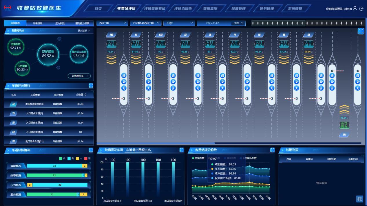此外,荔湾南站创设“效能医生”系统,对收费站平均过车时间、交易成功率、车道饱和度等19项指标进行实时监测并提出策略建议,形成“评-诊-治-监”闭环管理,系统可自动分析车流高峰时段,提前调整车道配置,确保收费站运行保持在最佳状态。